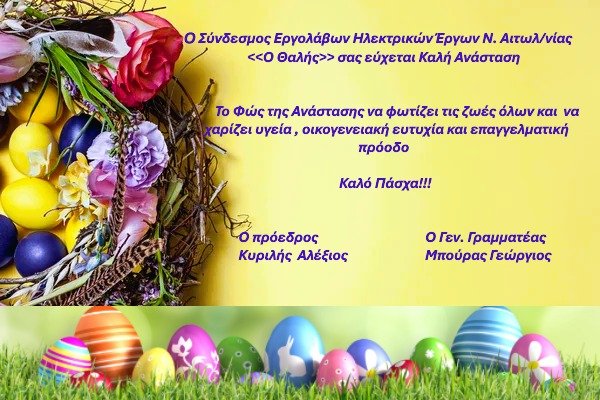 ΑΝΑΚΟΙΝΩΣΕΙΣ, Κοινωνικά, Σύνδεσμος Ηλεκτρολόγων Αγρινίου ΠΑΣΧΑΛΙΝΕΣ ΕΥΧΕΣ 2025 Posted by seh.agrinio 14 Απριλίου 2025 On 14 Απριλίου 2025